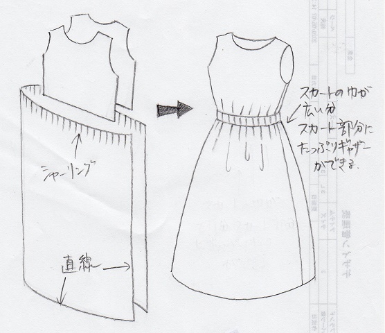 この構造で作ると、スカート部分だけを幅広くとって、シャーリングでぎゅっと縮めて上半身とつなぐので、スカート部分のギャザーがたっぷり寄って、身頃にはあまりギャザーが寄らなくてすっきりします。