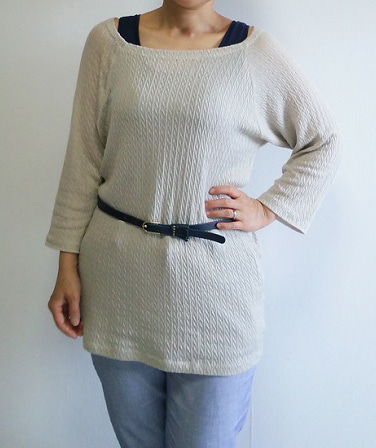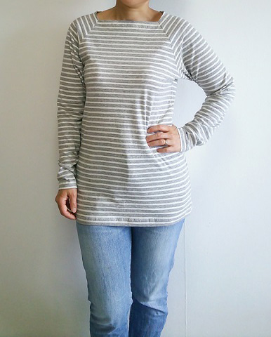 襟ぐりにリブニットをつけないスクエアタイプのため、襟も二つ折りだけでカンタンに処理できる上に、とってもスタイリッシュなスクエアネックになりました。