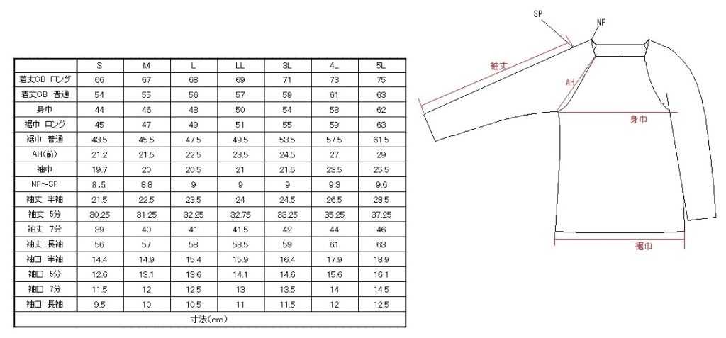 しかしながら、平置きしたときのバスト位置や裾の位置の「巾」を書く方が一般的のようです。